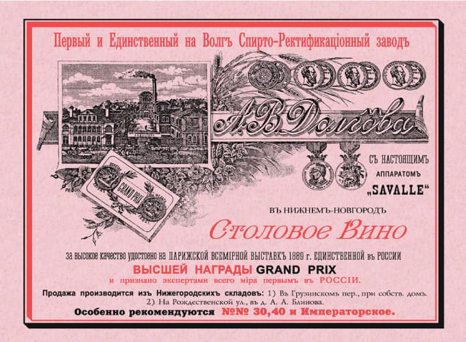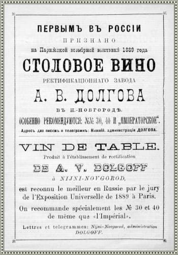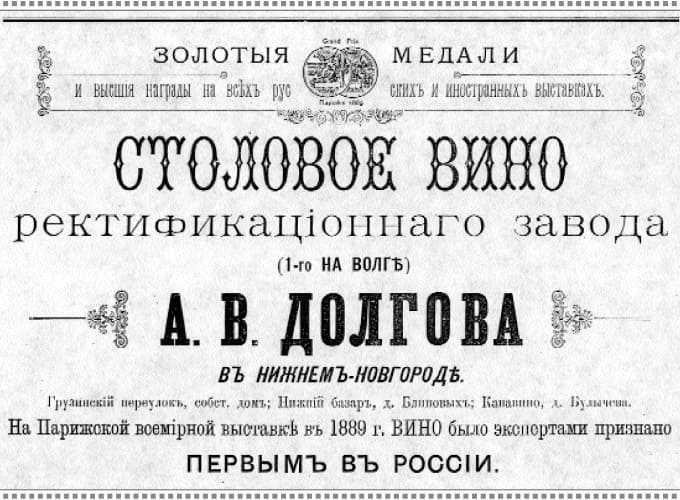Вторая половина XIX века. Производство водки в России перестает быть кустарным и выходит на новый промышленный уровень. Нижегородская фирма "А. В. Долговъ и К°" удостоена золотых медалей и высших наград на всех русских и иностранных выставках, в т. ч. Барселона (Испания, 1888), Булонь (Франция, 1892). В 1889 год – триумф на Парижской Всемирной выставке. «Столовое вино» А.В.Долгова (водка) было удостоено высшей награды «Grand Prix» и признано Лучшим в России. Завод имеет значительную часть рынка России и его продукция ценится выше именитых конкурентов «Смирновъ», «вдова Попова», «Шустовъ» и др.